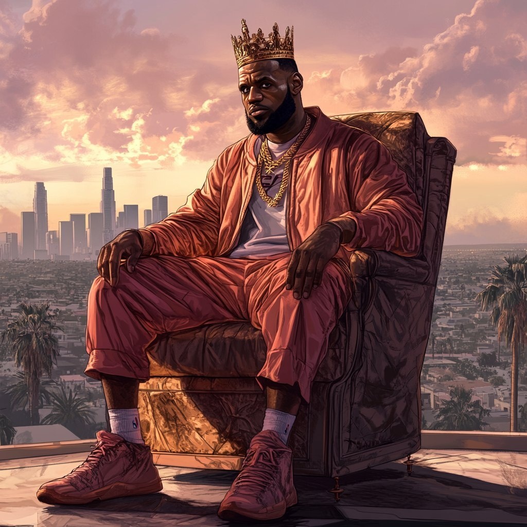 Создано на основе запроса: lebron james sitting on a throne chair wearing a crown with la city background fantasy ar 2:3