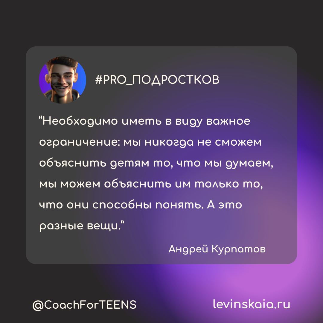 "Необходимо иметь в виду важное ограничение: мы никогда не сможем объяснить детям то, что мы думаем, мы можем объяснить им только то, что они способны понять. А это разные вещи." Андрей Курпатов. Книга "Счастливый ребёнок"