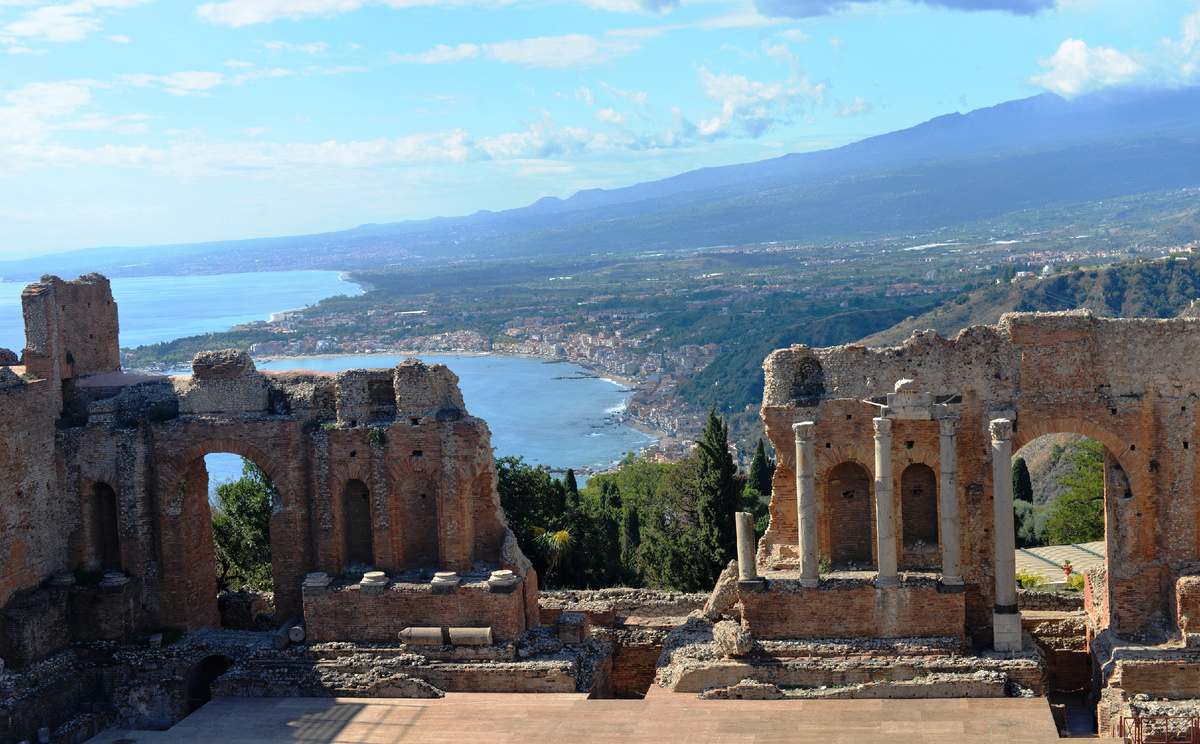 Главная доминанта города это античный греко-римский театр. Большой и довольно-таки хорошо сохранившийся комплекс руин с шикарными панорамами на город, побережье и вулкан Этна.