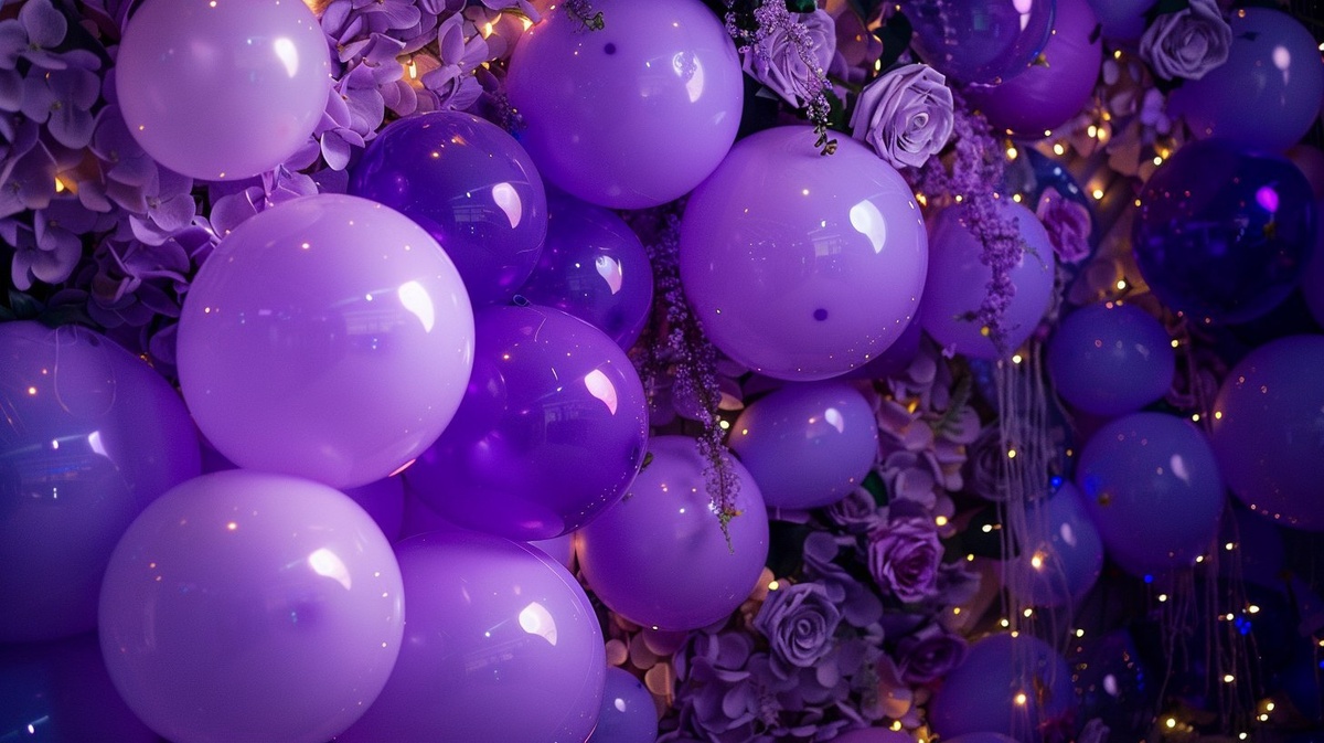 Создано на основе запроса: a back of purple ballons diferent tones, flowers and lights