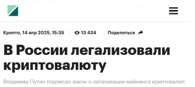 В России легализовали крипту. Ждем обвал фондового рынка Взлёт крипты неизбежен: 🟡Маск вложил в биткоин $1,5 миллиарда. 🟡Visa и Mastercard – уже начинают выпускать карты для оплаты криптой. 🟡Россия уже начала принимать оплаты биткоинами от “дружественных стран” В 2025 году ты можешь попасть в мощную волну роста. Например, недавно стрельнула монета DOGE – можно было вложить 500₽ и заработать 390.000₽. Те, кто уже колотит состояние - читают канал Андрея Котока. Потому что он шарит за политику и новости, которые шатают крипту туда-сюда. Сам продал машину и вложил 86000$, и зарабатывает стабильно по 100-200-300%. В его канале есть бесплатный курс по заработку на крипте. Доступен для первых 300 человек бесплатно. Успей записаться - https://t.me/+_T6iCUht5rZiYmMy