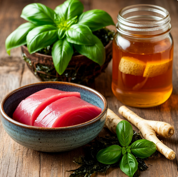 ✔ Русскую альтернативу — хреновую пену с мёдом. ✔ 200 г тунца сорта "аками" (или сёмги холодного копчения)