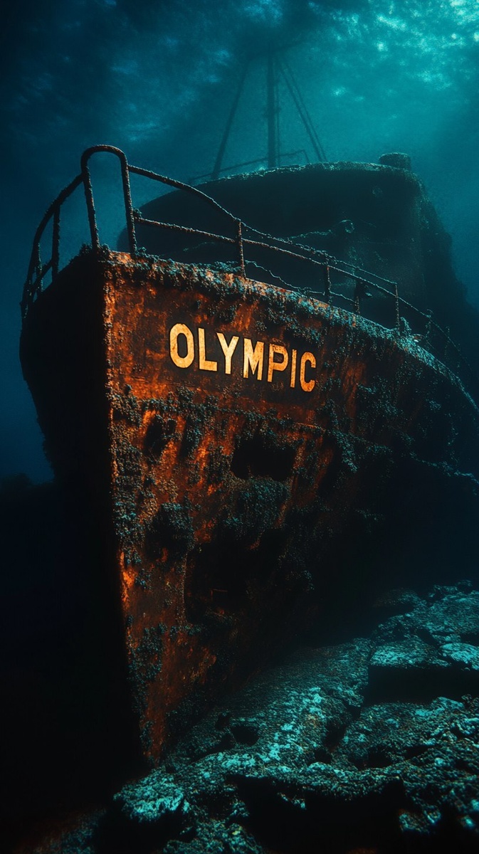 Создано на основе запроса: dark underwater scene, eerie deep sea lighting, camera focuses on a rusted sunken ship, the name "OLYMPIC" barely