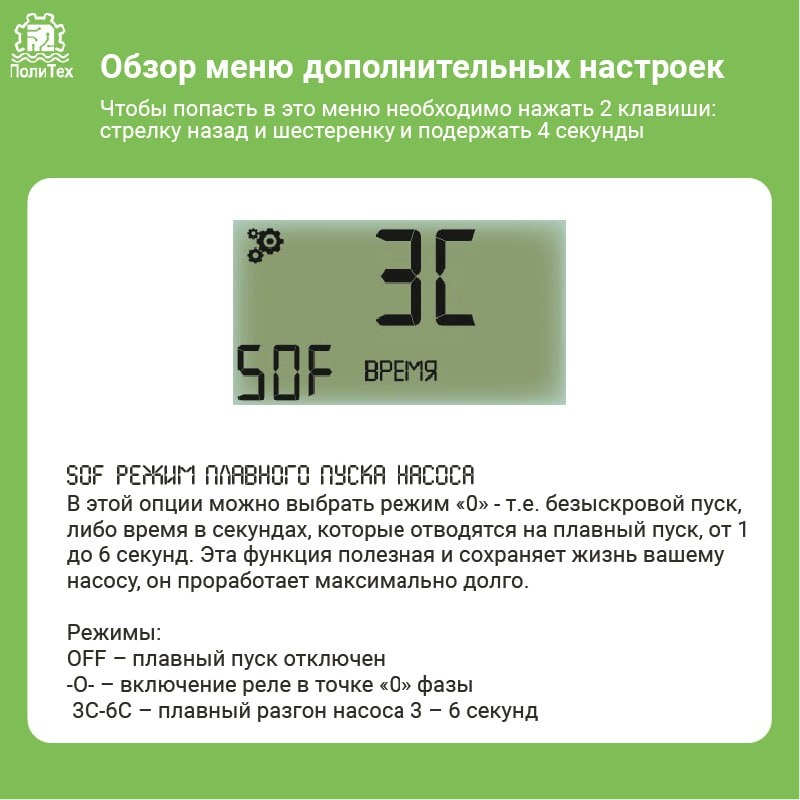 Обзор меню дополнительных настроек. SOF Режим плавного пуска насоса. SIP Настройка начальной мощности старта насоса.