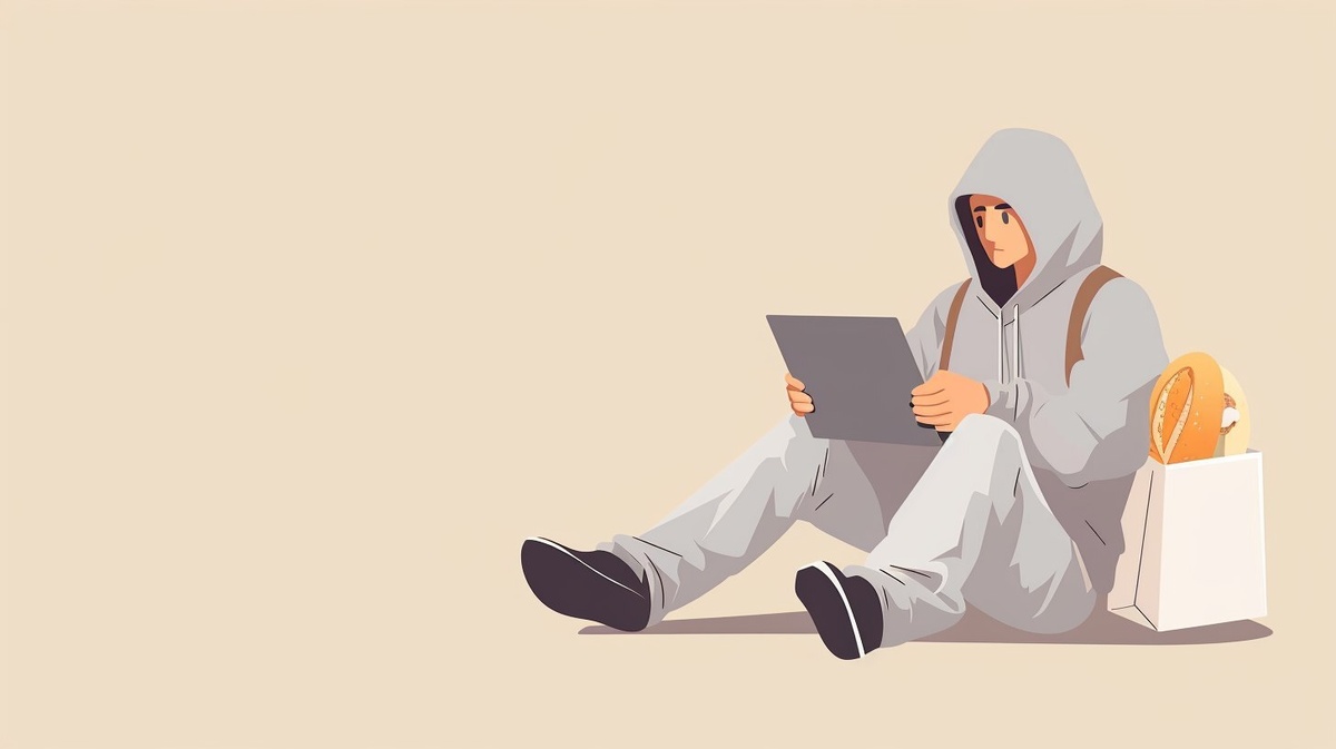 Создано на основе запроса: cartoon character in a gray hoodie holding a laptop and baguette, sitting casually, minimalist flat style, beige