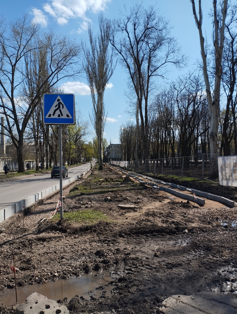 Здесь покажу, как устраивают новые тротуары. Конечно, для жителей Большой России это не новость, а я в Донецке такую современную технологию вижу впервые.