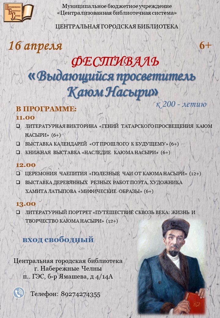 Центральная городская библиотека города Набережные Челны приглашает всех на городской фестиваль «Выдающийся просветитель Каюм Насыри», посвященный 200-летию выдающегося татарского ученого-энциклопедиста, поэта и просветителя Каюма Насыри.