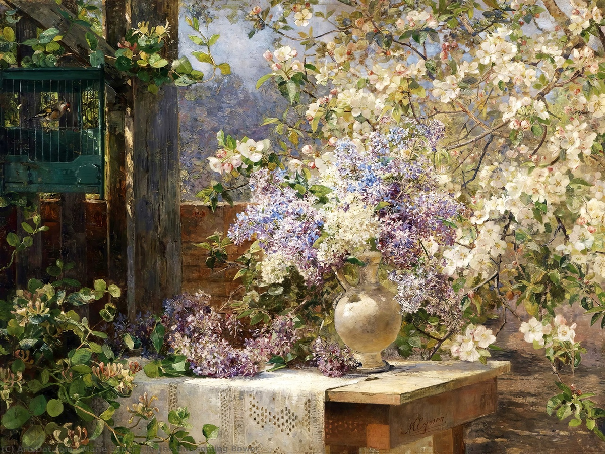Какой невыразимой прелести полна эта картина! Милое уютное местечко, прекрасный уголок старого сада. Кажется, от этой картины веет чудесными цветочными ароматами, и можно услышать, как весело щебечет птичка в клетке, и почувствовать кожей ласковые прикосновения солнечных лучей.