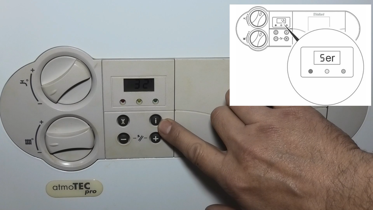 Всем привет! Убрать код 5er, но правильнее он читается как Ser можно самостоятельно. ВНИМАНИЕ! Управление параметром возможно в пункте меню d 84 (код 2-го уровня). Как войти Одновременно нажать кн. «i», «+». Попадаем в программу d.0 Попадаем в программу d.1 и ещё раз нажимаем на "+" Попадаем в программу d.97 Ещё раз нажимаем на кнопку «+» переходим на пункт 17. На 5 сек нажать, удерживать кнопку «i». Высветится меню 2-го уровня d 84. Выбрать d 84 кнопкой " i " Войти и выставить требуемое значение Ser. Лучше оставить прочерки, так код Ser больше не будет высвечиваться на дисплее. Зафиксировать установленные данные нажатием и удержанием 5 сек кн. «i». Изменить количество часов, и ошибка 5er (Ser) станет высвечиваться чаще или реже. При вводе учесть, что 1 соответствует 10 час. Определяя период между обслуживаниями горелки, принять во внимание: срок и интенсивность эксплуатации котла Вайлант, качество и вид «голубого топлива» (м