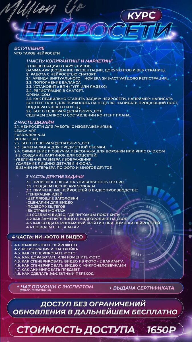 🔼🔼🔼🔼🔼🔼🔼🔼 Доступ к некоторым курсам из Тарифа «Все включено», можно приобрести по отдельности: ссылка на тариф ✅ Нейросети ✅ Чат-боты для бизнеса ✅ Трафик с Pinterest ✅ SMM профи Макеты с наполнением курсов и ценой представлены выше ⤴️ Для приобретения доступа ✍️ @irinapriv_80