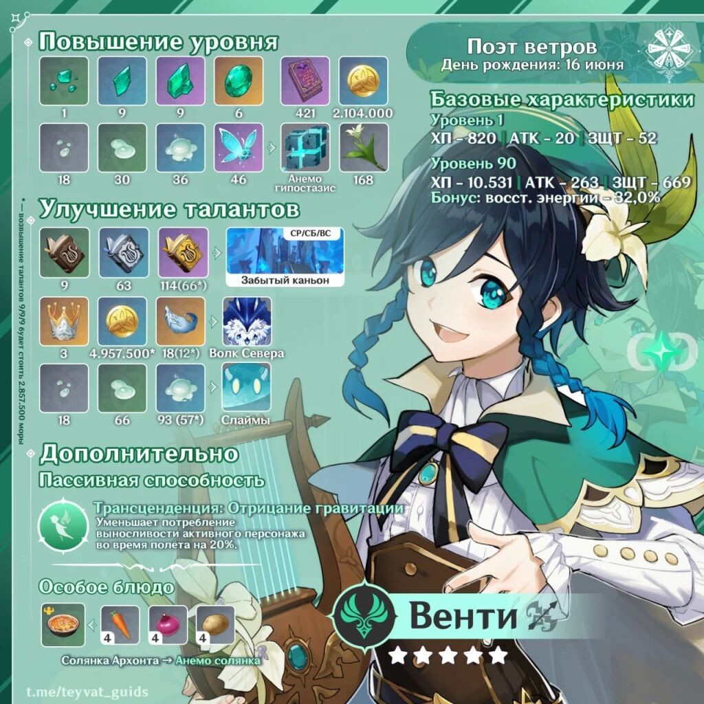 Материалы для прокачки уровня и талантов Венти: