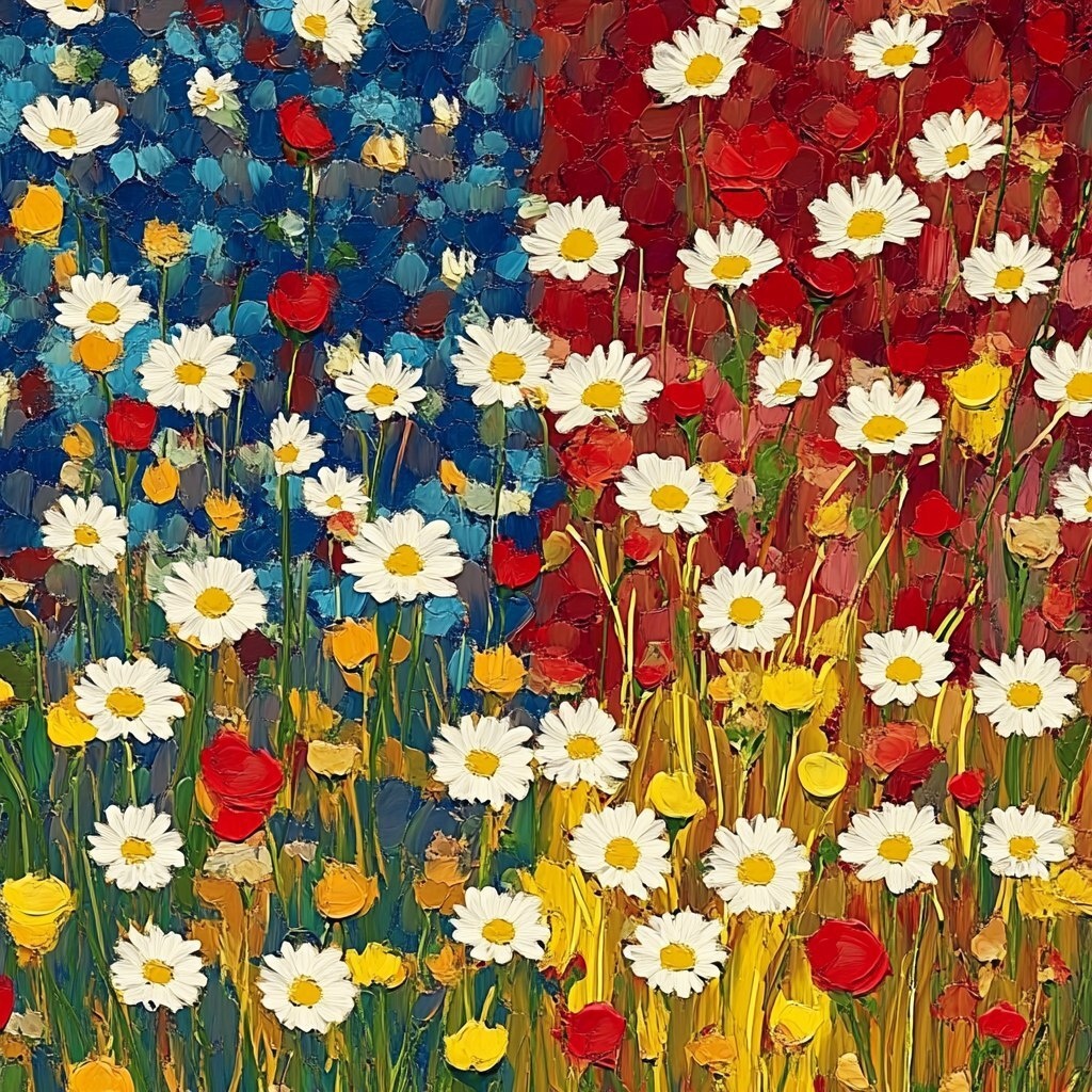 Создано на основе запроса: A digital painting of an abstract pattern composed of daisies and poppies, with vibrant reds, yellows, blues, greens, white flowers, and yellow grasses in a field setting. The background is a textured surface that resembles the American flag, with each color representing one of its three colors - blue for sky-blue, green for forest-green, and crimson or deep scarlet-colored petals for red. This design creates a dynamic contrast between floral patterns and fabric textures. --- Автоперевод: Цифровая живопись абстрактного рисунка, состоящего из ромашек и маков, с яркими красными, желтыми, блюзовыми, зелеными, белыми цветами и желтыми травами в полевых условиях. Необычно вышло? 🤔 https://dzen.ru/id/65c0c65c86e4f837c27b24d7 #ИИ #AI #нейросеть #midjourney #art