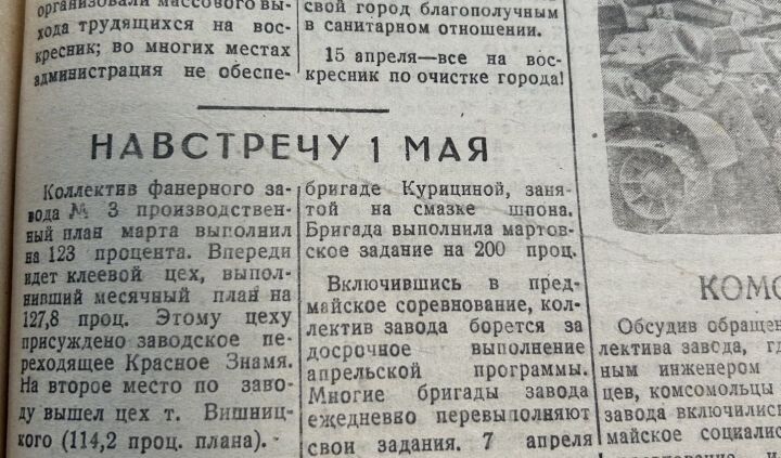 До празднования юбилея Победы остались считанные недели. Рассказываем о том, чем и как жил Зеленодольск и горожане в последние дни Великой Отечественной войны. А помогут нам в этом архивные подшивки газеты «Зеленодольский рабочий» за 1945-й год. Коллектив фанерного завода № 3 производственный план марта выполнил на 123%. Впереди идёт клеевой цех, выполнивший месячный план на 127,8 %. Этому цеху присуждено заводское переходящее Красное Знамя. На второе место по заводу вышел цех тов. Вишницкого (114,2 % плана). В соревновании по профессиям первое место завоевала вентилевая Вохромова из клеевого цеха. Ей присвоено звание лучшего бригадира на заводе. Переходящее заводское Красное Знамя присуждено бригаде Курициной, занятой на смазке шпона. Бригада выполнила мартовское задание на 200%. Включившись в предмайское соревнование, коллектив завода боретсяза досрочное выполнение апрельской программы. Многие бригады завода ежедневно перевыполняют свои задания. Седьмого апреля бригады тов. Хароньско