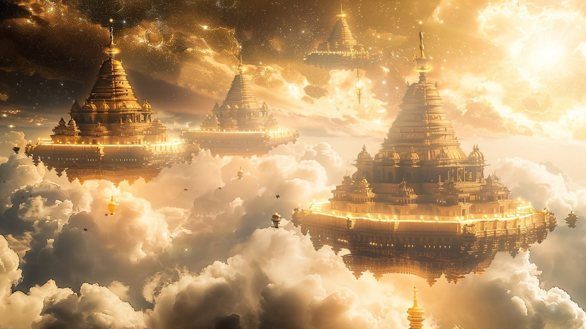 Создано на основе запроса: "Three massive flying cities made of gold, silver, and iron, floating high in the sky, ancient Indian