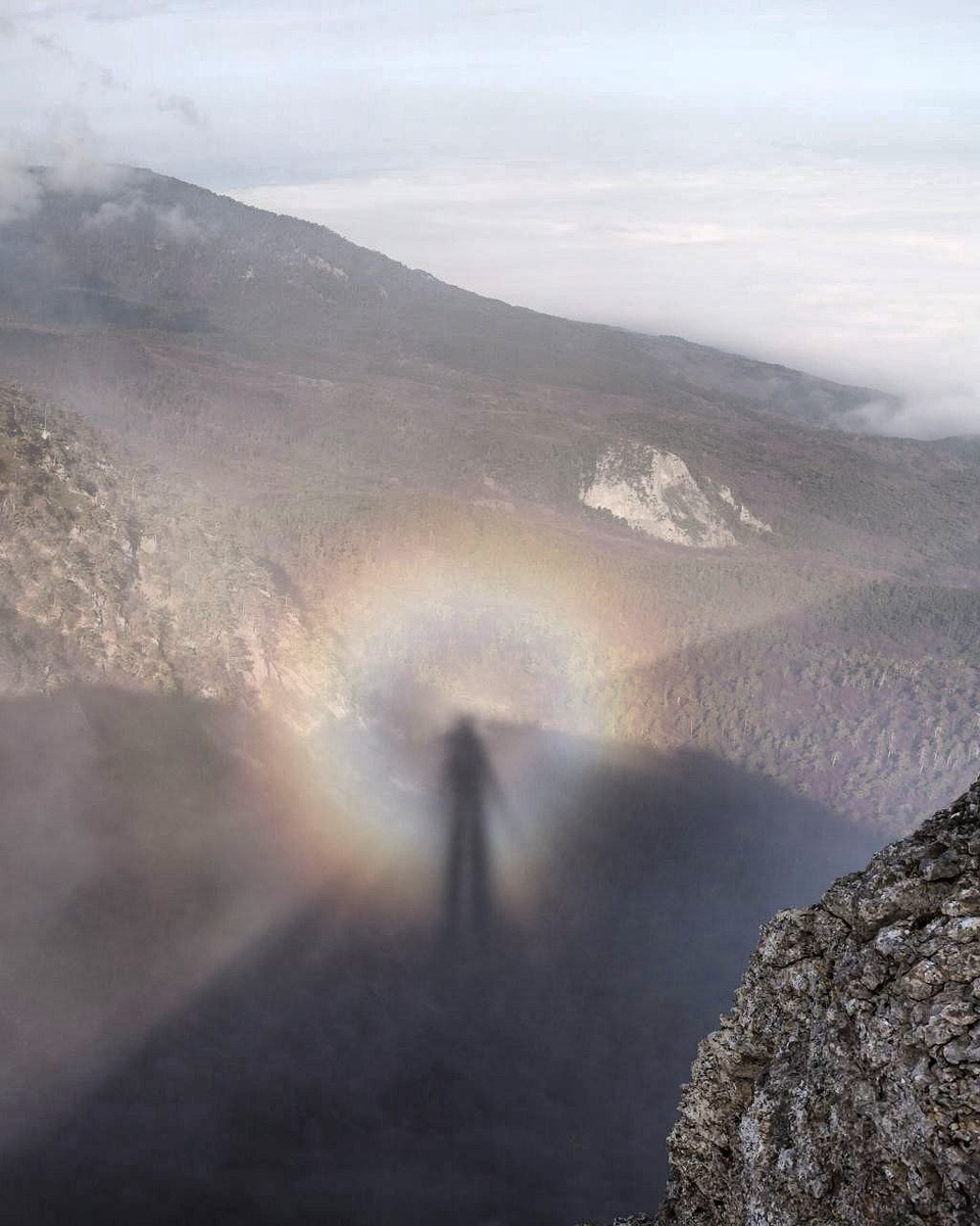 👻А вы когда-нибудь встречали Брокенского призрака? Это оптическое явление, возникающее, когда тень человека проецируется на облака или туман. ⛰ В этот раз он проявился на Беседке ветров в Крыму, на высоте 1482 м над уровнем моря. Здесь часто можно оказаться выше облаков. Обычно это происходит, когда солнечные лучи находятся позади наблюдателя, а впереди — густой слой влажного воздуха. Такое удивительное явление можно встретить в высоких горах, ближе к закату или рассвету, когда солнце светит уже сбоку, прямо в спину. 📷 forest_nimph ⛏ Юг Край