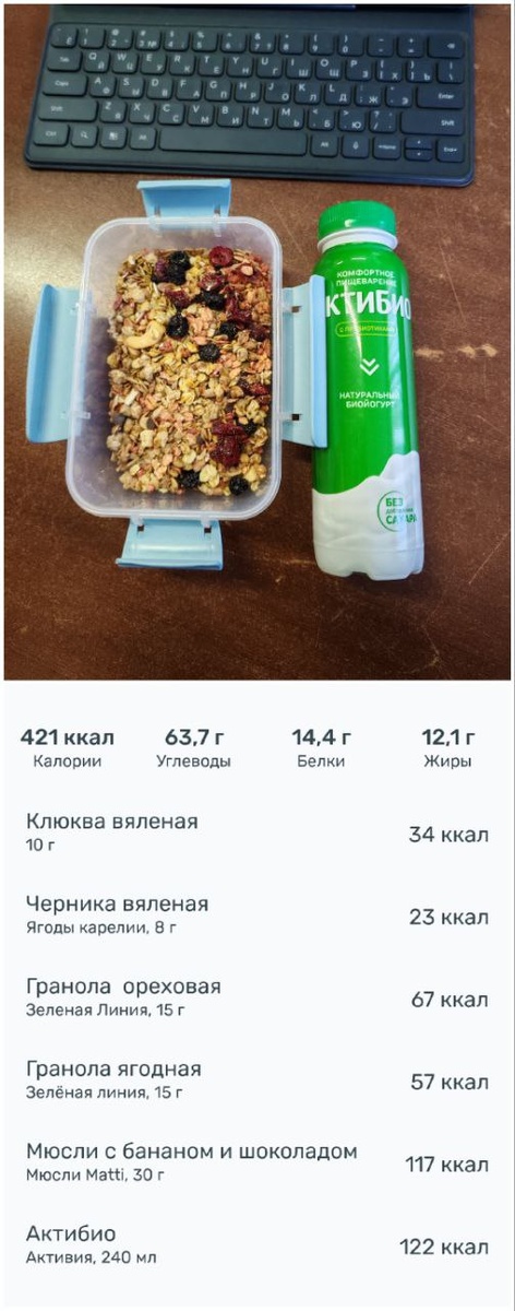 😎 Завтрак в нашем заведении... 🗓 15.04.25 09:00 💪 День похудения: 97 ⬆️Список продуктов и КБЖУ на фото. ✍️ На работу приехал, позавтракал, теперь учёба... 🤔 Мда, рацион пока выглядит одинаково, дома хоть сладкое можно менять... 💡 А ещё надо купить новых ягод разных, а то черника кончилась... #завтрак 😎 Roman Legas | Life