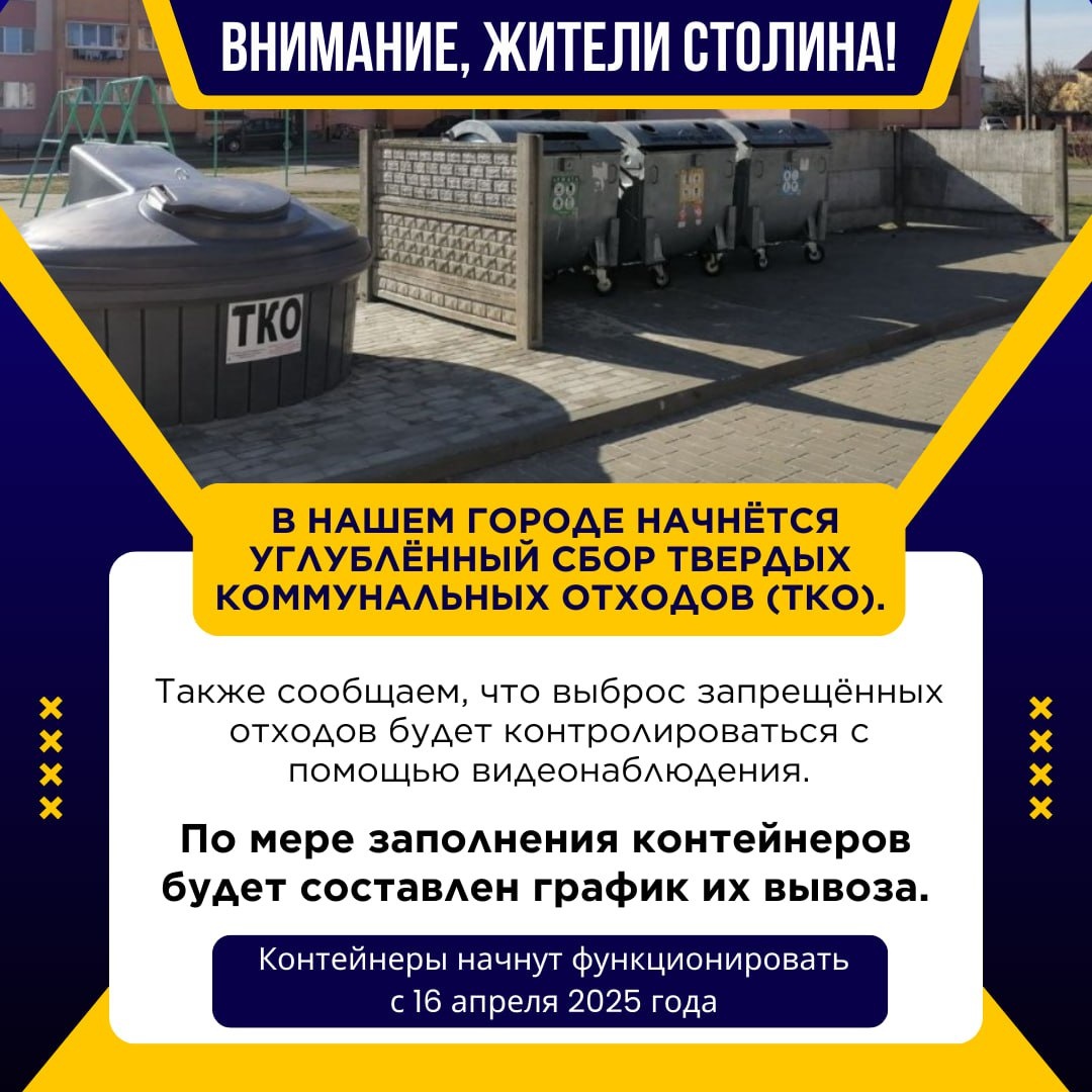 Внимание, жители Столина! 16 апреля 2025 года, в нашем городе начнётся углублённый сбор твердых коммунальных отходов (ТКО). Обращаем ваше внимание, что в контейнеры запрещено выбрасывать следующие виды отходов: 📌1. Опасные отходы: батарейки, аккумуляторы, лампы, химикаты, медицинские отходы. 📌2. Строительные отходы: кирпичи, бетон, плитка, строительные материалы, стекло. 📌3. Электронные отходы: старые телевизоры, компьютеры, бытовая техника. 📌4. Крупногабаритные отходы: мебель, матрасы, крупные предметы. 📌5. Жидкие отходы: масла, краски, растворители, химикаты. 📌6. Зелёные отходы: трава, ветки, листья. Также сообщаем, что выброс запрещённых отходов будет контролироваться с помощью видеонаблюдения. В случае выявления нарушений виновные могут быть привлечены к ответственности в соответствии с административным кодексом Республики Беларусь. По мере заполнения контейнеров будет составлен график их вывоза.