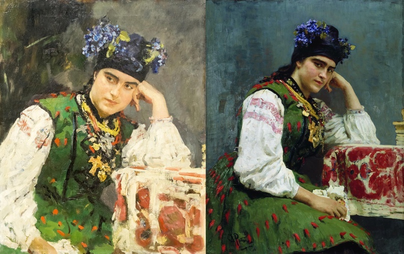 «Где больше мазни — там Серов. Репин себе такого не позволял». Это комментарий одного из моих читателей. Что ж, не все любят Валентина Серова так же, как Илью Репина. Имеют право, конечно. А я всё же дам более развернутый сравнительный анализ. Илья Репин написал портрет Драгомировой в 1889 году. При этом плечом к плечу с ним работал его ученик, Валентин Серов. Всего два года, как он написал свою «Девочку с персиками». Эта работа осталась в семье Мамонтовых. Поэтому на тот момент о художнике ещё мало знали. Обратите внимание, что девушка Серова смотрит немного в сторону. Её взгляд как раз направлен в это время на основного портретиста, Илью Репина. Серов писал портрет бесплатно, для себя, просто вдохновившись чертами лица девушки. А когда он уехал, то оставил портрет Репину. Тот передал его девушке в подарок, однако перед этим добавил от себя несколько мазков краски (только в районе одежды, не лица). Так что и в этом портрете есть рука Репина:). Скорее всего, если бы Серов писал портре