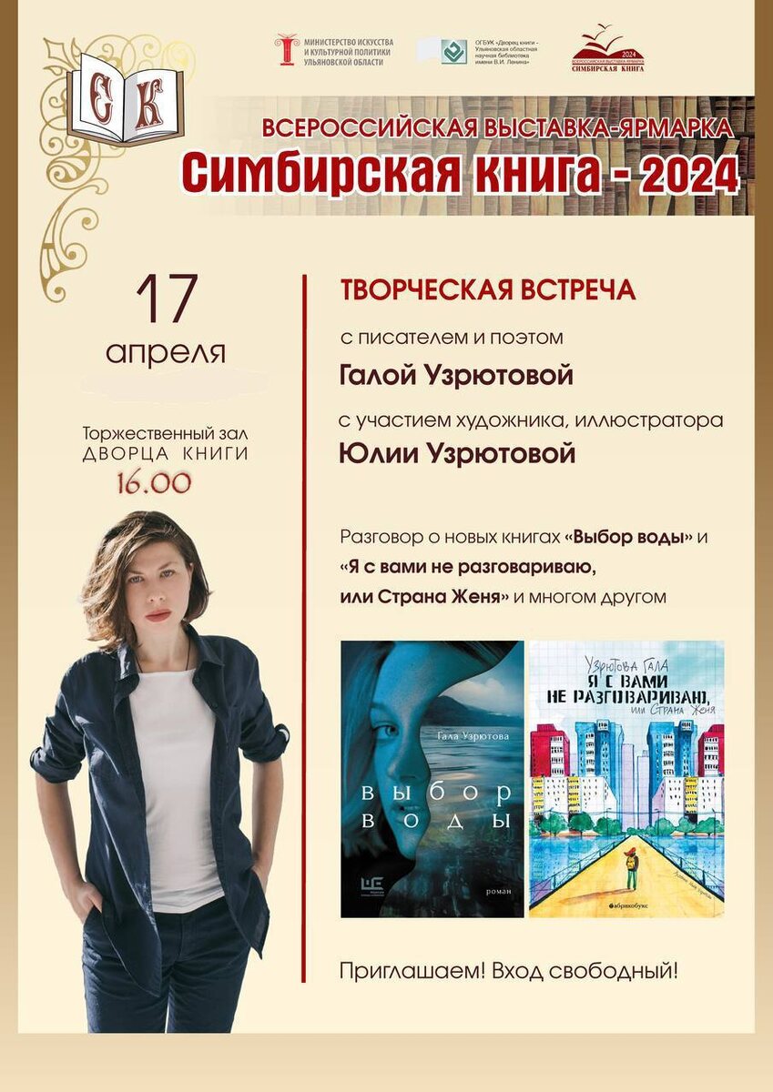 Творческая встреча с писателем и поэтом Галой Узрютовой с участием художника, иллюстратора Юлии Узрютовой 🗓️ 17 апреля в 16.00 📍Дворец книги Автор представит свои новые книги «Выбор воды» и «Я с вами не разговариваю, или Страна Женя». ▪️Роман «Выбор воды» вышел в «Редакции Елены Шубиной» в 2024 году в серии «Европейский роман»: Героиня романа «Выбор воды» Кира — из поколения 35 летних эскапистов, убегающих от прошлого, от реальности и от самих себя, и путешествующих из страны в страну — лишь бы не возвращаться домой. Атлантический океан в Лиссабоне и Тихий океан во Владивостоке, Гранд канал Венеции и фьорды Норвегии, Балтийское море в Латвии и Северное море в Голландии, реки Германии, Англии, Испании — Кира объездила 24 страны с рюкзаком за плечами, полным костей животных, рыб и птиц. Но ни одна вода не приняла их. В очередной попытке совершить ритуал и отдать кости воде — на озере Бохинь в Словении — Кира, обходя озеро по кругу, распутывает последствия детской травмы, продолжает