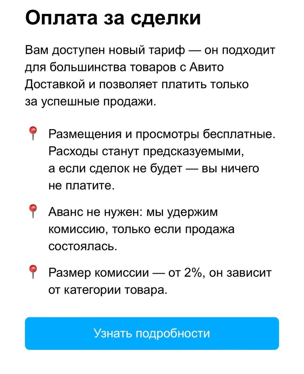Тариф за сделку — я так его ждала! А потом… А потом посчитала, сколько плачу за просмотры на своем рабочем профиле, сколько делаю отправок и сколько буду платить за успешную сделку. И получается… одинаково. Да, все зависит от объема товаров, цен на них и кол-ва заказов. Возможно, когда продаж будет меньше, чего я себе не желаю, будет выгоднее. Но пока вот так. Поэтому если вы тоже ждёте этот тариф, то посчитайте всю экономику, может оно того не стоит. А если стоит, то желаю вам скорейшей весточки от авито с возможностью подключить этот в общем-то неплохой тариф 👌 Предлагали вам его? Или может уже пользуетесь?