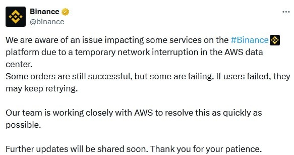 ⚠️ Binance и KuCoin временно приостановили вывод средств из-за сбоя в центре обработки данных Amazon Web Services (AWS