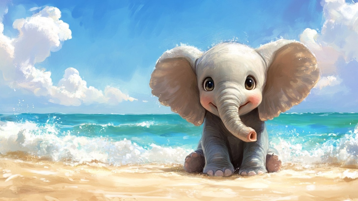 Создано на основе запроса: A cute cartoon-style baby elephant playing by the ocean, bright blue sea in the background, sandy beach, sunny