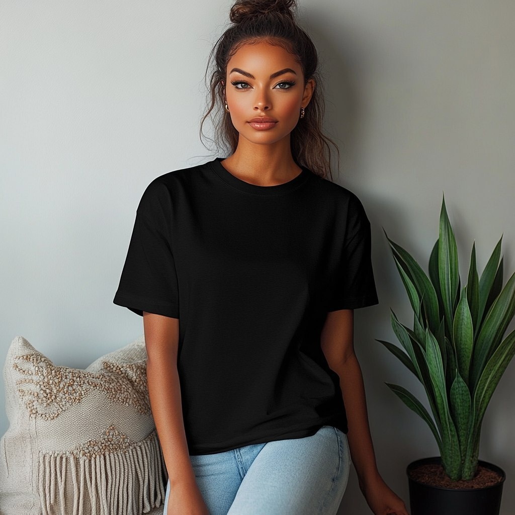 Создано на основе запроса: gildan oversized black t-shirt mockup for print on demand designs, with a close-up shot of the t-shirt with no folds or wrinkles, woman with hourglass figure facing completly forward, wearing oversized black tshirt. It is a Medium shot to capture both the bottom of the face and lower torso, model is leaning against a blank white wall with one boho pillow and one small Dracaena trifasciata plant beside her, bright studio lighting, high brightness exposure camera, womans shirt is more oversized --- Автоперевод: Джильдан негабаритный макет футболки для печати по дизайну спроса, с крупным планом футболки без складок или морщин, женщина с фигурой в песочных часовых часах, которая полностью обращена вперед, носят негабаритную черную футболку. Классно выглядит? 🤔 https://dzen.ru/id/65c0c65c86e4f837c27b24d7 #ИИ #AI #нейросеть #midjourney #art
