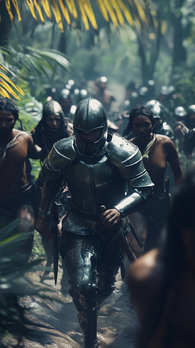 Создано на основе запроса: Spanish conquistadors in metal armor chasing terrified indigenous people through a dense Caribbean jungle
