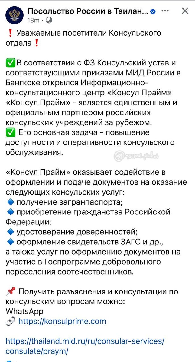 Связывайтесь исключительно только по контактам указанным на сайте, все остальные «представители» являются мошенниками https://thailand.mid.ru/ru/consular-services/consulate/praym @real_phuket