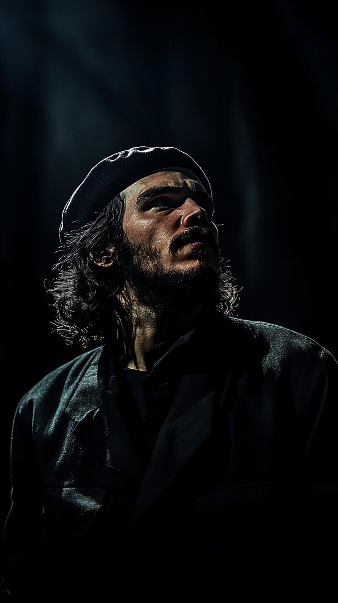 Создано на основе запроса: Che Guevara standing in shadows, moody chiaroscuro lighting, half his face lit, wearing iconic beret, symbolic of
