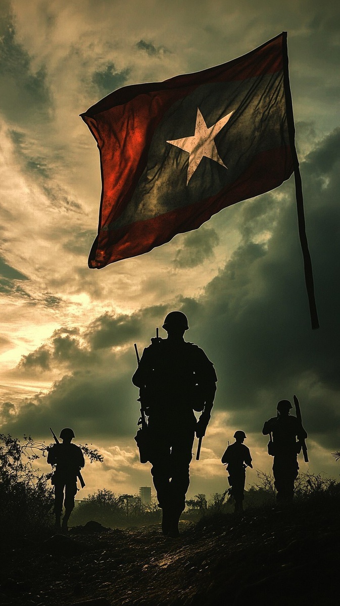 Создано на основе запроса: worn Cuban flag waving in the wind, silhouettes of armed revolutionaries walking away, cloudy dramatic sky