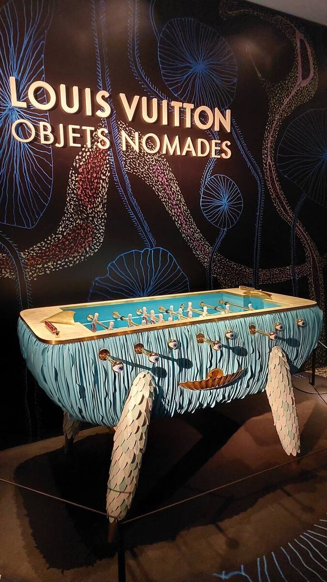 Louis Vuitton с 2012 года сотрудничает с ведущими дизайнерами мира, занимаясь созданием экспериментальных предметов мебели. От гамака до складного табурета, от стульев до ширмы — каждый предмет выпускается в ограниченной серии. Все элементы экспозиции представляют собой сочетание художественного видения дизайнера и творческих навыков мастеров LV. Стол для настольного футбола от Louis Vuitton как объект искусства.