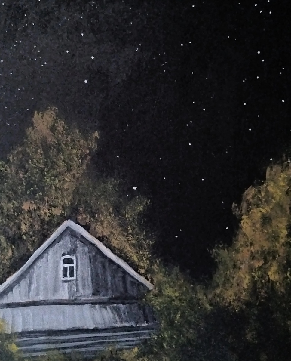Осенняя ночь в деревне. Лирическая зарисовка. Рис. автора. Потусторонняя полоска заката. Осенние поля плавно переходящие в космос. Едва различимые очертания крыш. Сиротливый отчаянно-одинокий свет в окне и над всем этим бесформенная, нависающая тайна жизни и смерти. Звёздный космос похож на огромный оркестр играющий в разнобой. Вот залаяла собака, что-то зашуршало, заскрипело. Я открываю глаза и вижу перед собой огромную луну. Я долго смотрю на неё и вдруг понимаю, что меня здесь нет. Встаю с кровати, выхожу во двор, закуриваю и вижу родные сараи, спящие осенние травы и всё тот же звёздный "ужас" над головой. Чертыхнувшись иду к буфету, наливаю рюмку водки, выпиваю залпом, снова ложусь и медленно проваливаюсь в другой мир, где всё размыто и нет ни пространства, ни времени. Но и там меня что-то преследует, уже совсем непонятное, жуткое, не здешнее.