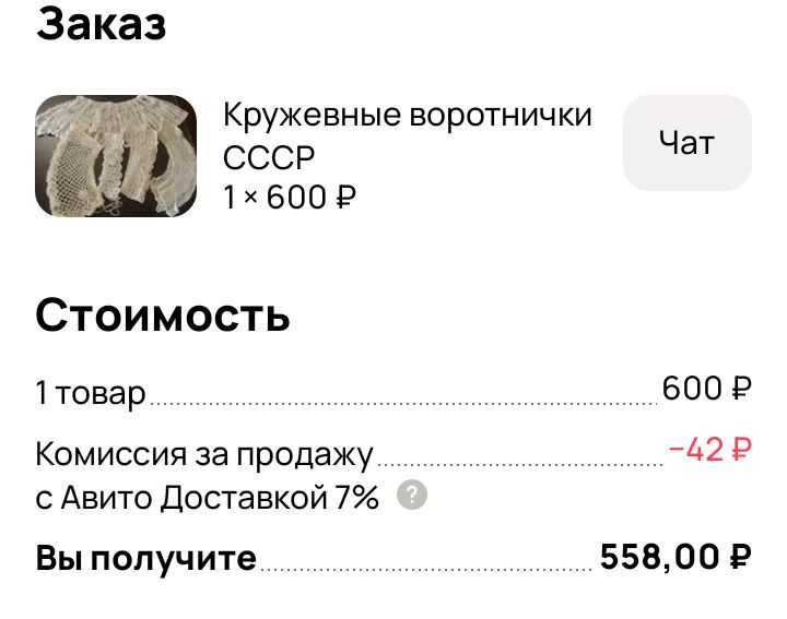 Доброго дня! Наконец-то первая продажа апреля, я уже думала так и пойдёт месяц тишины. Как я поняла отсутствие продаж связано с повышением цен на доставку, некоторые утверждают, что с такими ценами дешевле напрямую почтой. В этом случае и 7% комиссии с продавца не возьмут. Тем не менее что-то да продаётся. А продала я два воротничка с Авито Доставкой, которые когда-то вязала моя бабушка. +558р за два изделия, которые мне на нужны. Остались ещё три поменьше. Очень даже симпатичные, но куда такие носить в современном мире я не представляю. И да, с одной стороны мне хочется сохранить память о бабушке, но реально это не та вещь, которую я хочу хранить. Так что отправились в свой новый дом, возможно, ещё порадуют кого-то. А зачем вообще покупают вещи прошедшей эпохи? Я родилась ещё в СССР, хоть жизнь постепенно менялась, но многие вещи продолжали жить в наших домах. Вот там в теплом детстве был советский сервиз в горошек, кукла Катя и вышитый рушник. Сервиз разбился, куклу подар