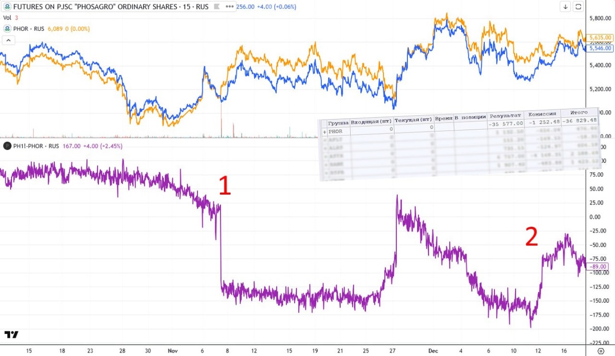 Совет директоров рекомендовал дивиденды. Уже можно считать будущую прибыль или есть нюансы? Разберем прошлогоднюю ситуацию в ФосАгро #PHOR. 7 ноября 2024 года вышла новость о том, что совет директоров ФосАгро рекомендовал выплатить дивиденды за 9 месяцев 2024 года в размере 249 руб. на акцию. График раздвижки пары фьючерс – акция (изображен на нижней половине рисунка), как и положено, на новости ушел вниз – Событие 1. 12 декабря 2024 года опубликована новость о том, что акционеры ФосАгро утвердили дивиденды за 9 месяцев 2024 года в размере 126 руб. на акцию, что почти вдвое ниже раскрытой рекомендации (249 руб.) - Событие 2. Также на графике мы видим, что между двумя вышеуказанными событиями происходило еще «нечто», не отраженное в публичных новостях. На этом »нечто» 27-28 ноября многие потеряли немало денег. А кто-то, вероятно, заработал. Что делать в таких случаях арбитражеру 1. Арбитражная позиция, открытая под ожидание дивидендного гэпа, может стать убыточной — пересчёт моде