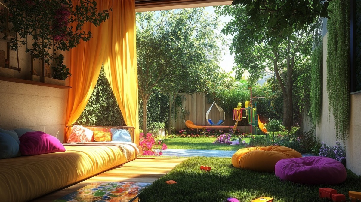 Создано на основе запроса: a playful room children room playful in pixar style where you can see on the window the backyard garden