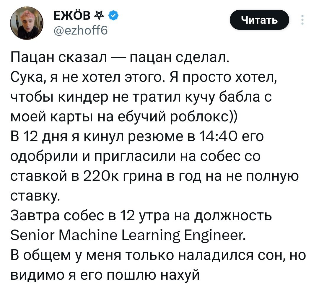 Необычный карьерный ход отца ради сына в Roblox! Как один папа решил проблему внутриигровых покупок История пользователя @ezhoff6 (Yauheni Zhrkou) стала настоящим хитом в интернете! Отец нашел оригинальное решение для контроля расходов своего сына на "плюшки" в Roblox: он устроился в компанию на позицию Senior Machine Learning Engineer. Теперь его сын будет получать бонусы бесплатно! Senior Machine Learning Engineers в Roblox занимаются разработкой алгоритмов, которые улучшают поиск и рекомендации, а также обеспечивают безопасность на платформе. В компании сейчас открыты вакансии в этой области, что подчеркивает важность специалистов в машинном обучении. При этом Roblox продолжает оставаться одним из лидеров по созданию 3D-игр и виртуальных миров, и история этого отца вдохновляет многих родителей искать инновационные решения в управлении цифровыми расходами детей. #Roblox #игры #технологии #машиннообучение А что вы думаете по этому поводу?