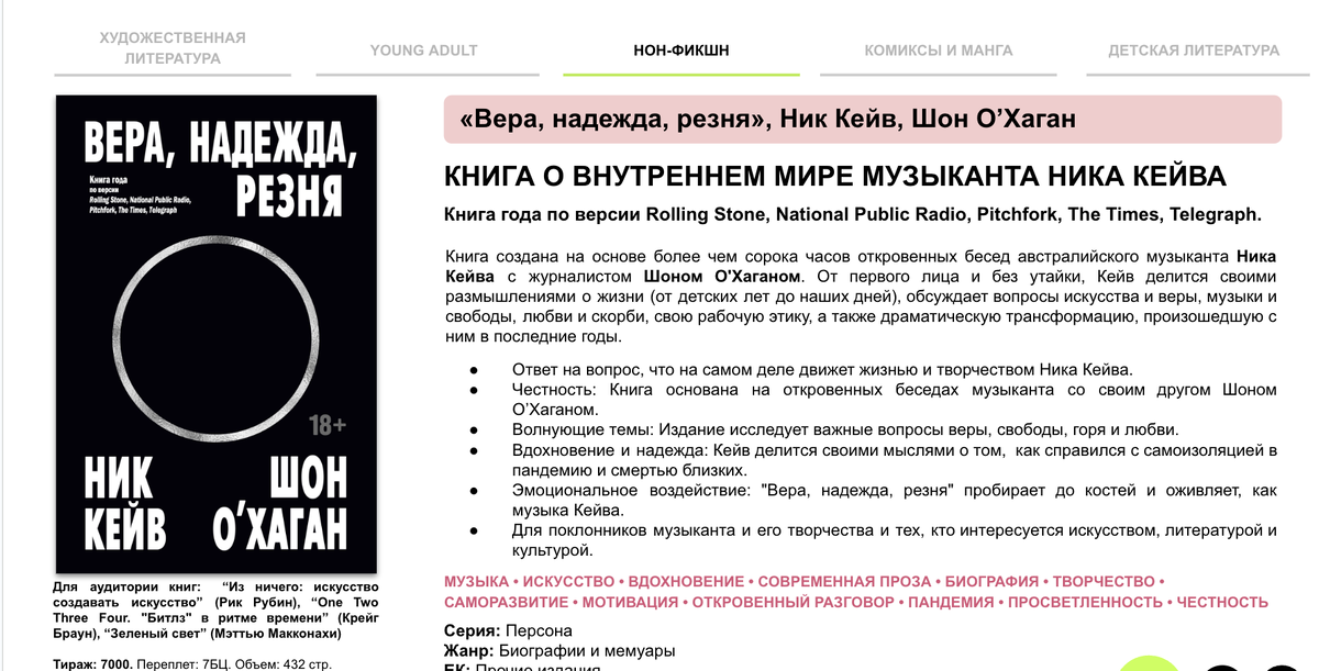 Как всегда, представляю анонс новинок одного из самых крупных наших издательств в сериях художественной литературы, нон-фикшн, янг-эдалт, комиксов и манга. На этот раз меня лично заинтересовали сразу несколько книг жанра нон-фикшен, но в анонсе, конечно, есть и интеллектуальная проза, и детективы, и триллеры, и фэнтези, восточная литература, комиксы. Можно выбирать на любой вкус. Я постаралась включить в статью всё самое интересное. И начну я с той книги, которую обязательно хочу прочитать: 1. Вера, надежда, резня. Ник Кейв, Шон ОХаган 2. Поворот винта. Генри Джеймс Классика, но я её не читала, поэтому заинтересовалась. А кто читал? Что скажете? 3. И за мной придут. Эльза Гильдина И снова много слышала об авторе, нот ничего не читала. Может, у вас есть что сказать на эту тему? 4. Убийство в Атлантике. Джон Д. Карр Не могу сказать, что я спец по разным переводам. Просто делюсь с вами вот такой новинкой. 5. Куросиво. Рока Токутоми Это я знаю, какой читатель заинтересуется. Специально для
