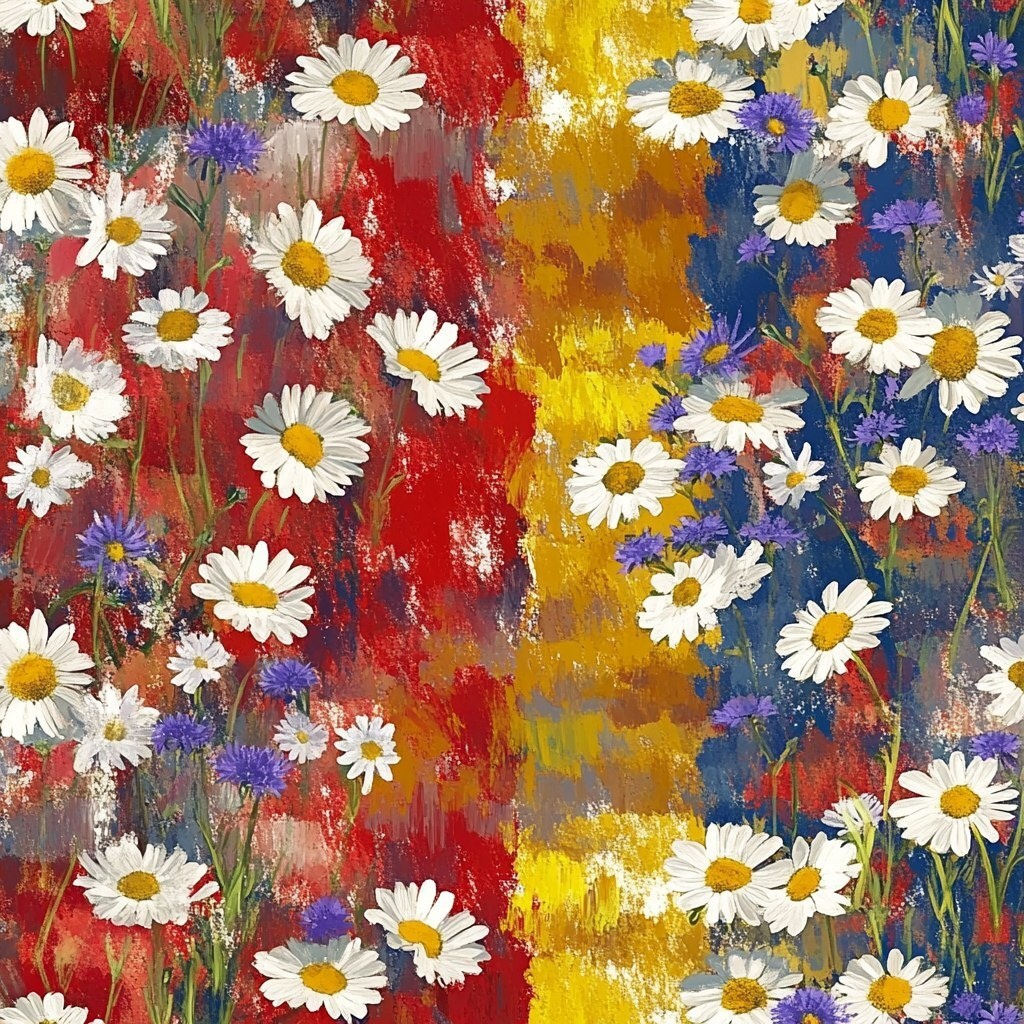 Создано на основе запроса: A field of wildflowers, with red and yellow stripes on a flag-like background. The flowers include white daisies, lavender purple cosmos, golden marigolds, bluebells, and mossy grasses, all interwoven to create an impressionistic effect. This pattern is designed for fabric printing, featuring the colors of red, white, and blue. It has an abstract style, with a painterly texture that suggests movement and depth, in the style of Jules Pascin. --- Автоперевод: Поле полевых цветов, с красными и желтыми полосами на флагзовом фоне. Круто получилось? 🤔 https://dzen.ru/id/65c0c65c86e4f837c27b24d7 #ИИ #AI #нейросеть #midjourney #art