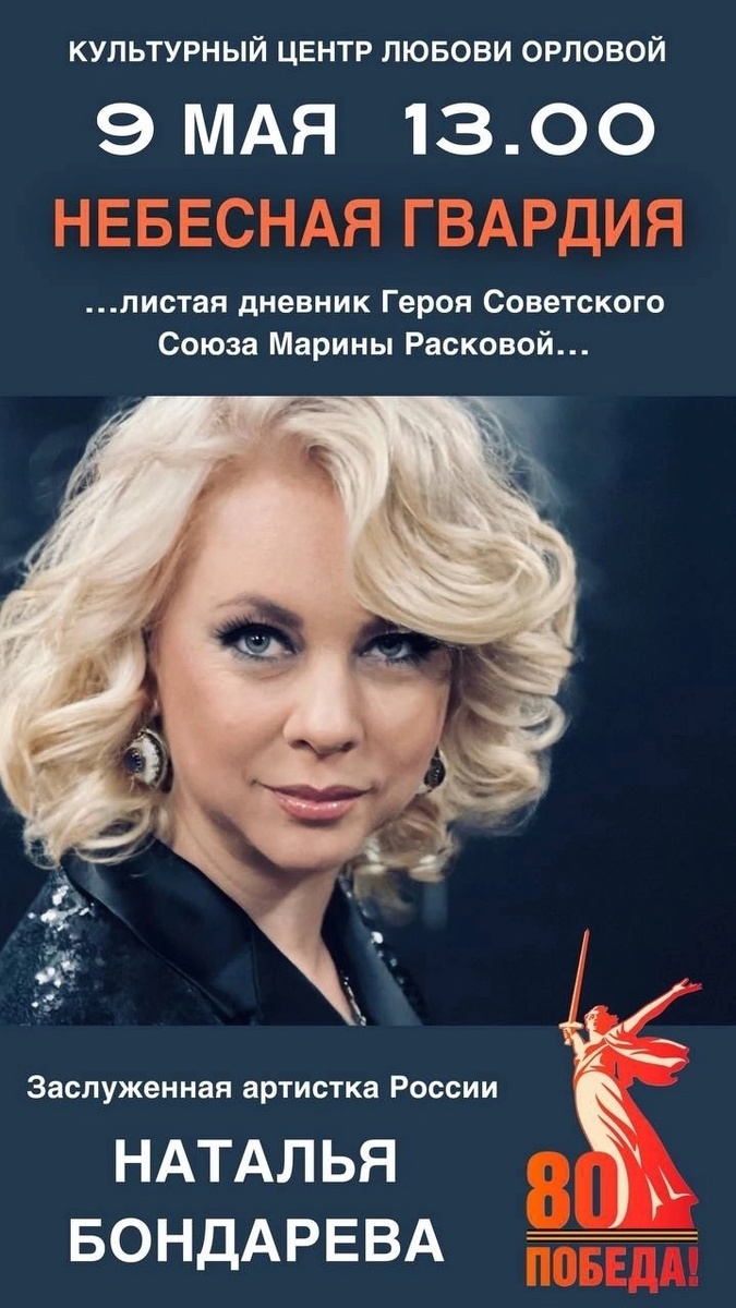 9 мая в Культурном центре Любови Орловой состоится концертная программа «Небесная Гвардия», посвященная 80-летию Великой Победы.