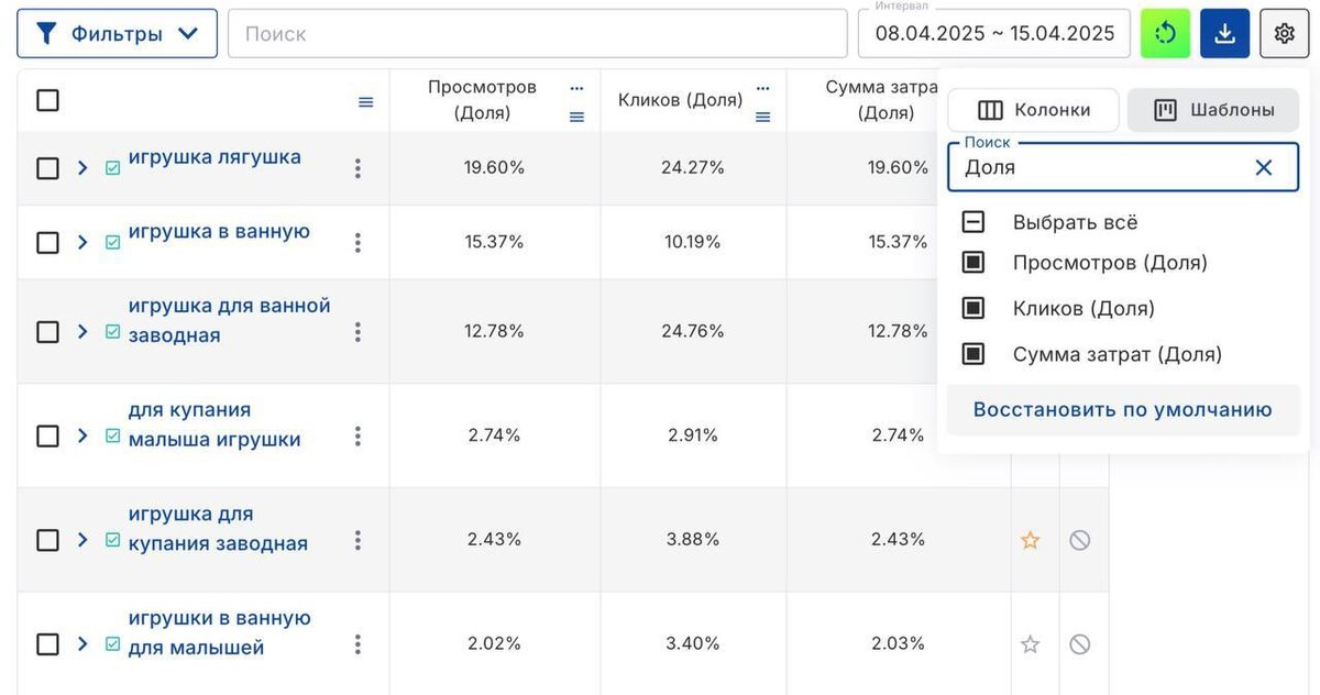 🔥 Новые колонки в Ключевых фразах Мы добавили 3 новые колонки для ещё более точной аналитики: 📊 Просмотров (Доля) – какой вклад ключевая фраза вносит в общий объём показов. 🖥 Кликов (Доля) – процент кликов по фразе от общего числа кликов. 💸Сумма затрат (Доля) – сколько бюджета “съедает” конкретная фраза. Теперь вы легко увидите, какие ключи реально работают, а какие просто тянут бюджет вниз. Колонки доступны: — В таблице пресетов — В подтаблице кластеров Используйте обновление, чтобы ещё точнее оптимизировать кампании и усиливать только сильные запросы! #Сервис #Обновление