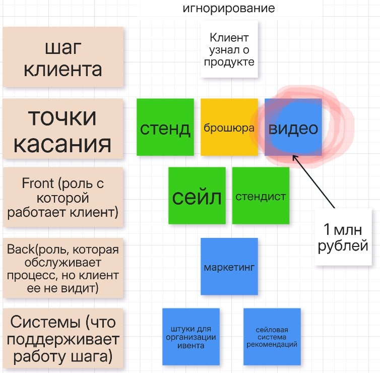 Продуктовое видео стоит 1 млн рублей. Покупаешь? 💰 Речь идет об 1 продуктовом видео, чисто на стенде показать. Там обычно есть экраны. Чтобы экран не простаивал, можно крутить контент длительностью минут 5. За один миллион рублей. Ну так что, берем, не берем? Я видела такие варианты ответа: 💸 У нас бюджет на маркетинг 30 млн на этот месяц, а чего не берем 💵 У нас бюджет на маркетинг 1 млн на год. Ты што, какой 1 видос В посте в блоге сразу становится понятно, что вопрос с подвохом. И нужно спрашивать "а чтобы что?". Метрику бы какую померить, зафиксировать результат надо. А какая норма рынка, а какой у нас контекст для принятия решения. Хочется что-то как-то эцсамое Предлагаю вариант, что можно сделать. С применением Service BluePint Видео - точка касания для клиента на этапе игнорирования или первичного осмысления ценности продукта. В воронке это на самом верху. В Service BluePrint я предлагаю оценивать плотность взаимодействия каждого материала с клиентом. И называю это пл