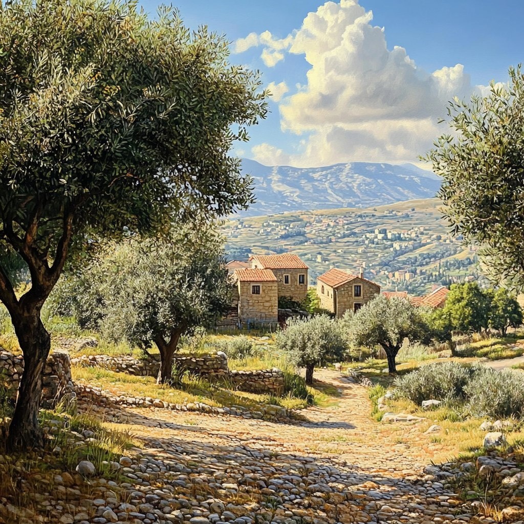 Создано на основе запроса: hyper realistic, HD, lebanese nature, with olive trees and clear sky, houses, village