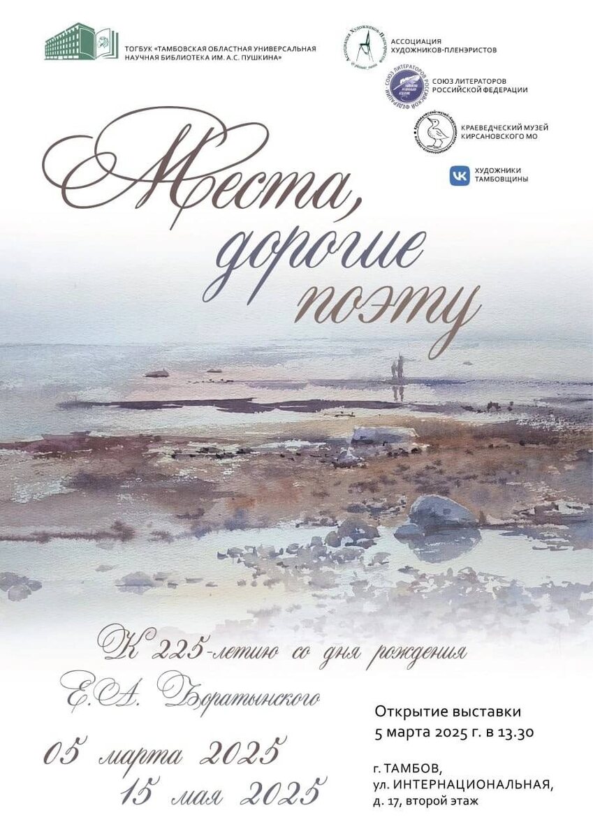 До 15 мая I Выставка «Боратынский глазами художников» В этом году мы отмечаем 225-летие Евгения Абрамовича Боратынского. В честь этой даты Ассоциацией художников-пленэристов и библиотекой была подготовлена выставка художественных работ, освещающих ключевые моменты жизни и творчества поэта. В экспозиции, которая торжественно откроется для посетителей 5 марта в холле второго этажа Пушкинской библиотеки, можно будет увидеть и столь любимую поэтом Мару, и Санкт-Петербург, и Казань, Мураново, и Выборг. Совершить путешествие по местам, с которыми судьба связала особенно дорогого для жителей Тамбовского края поэта – Евгений Абрамович родился и провел детские годы в имении Мара Кирсановского уезда Тамбовской губернии, – помогут более двадцати работ художников из разных уголков России. Вход свободный в рабочие часы библиотеки.