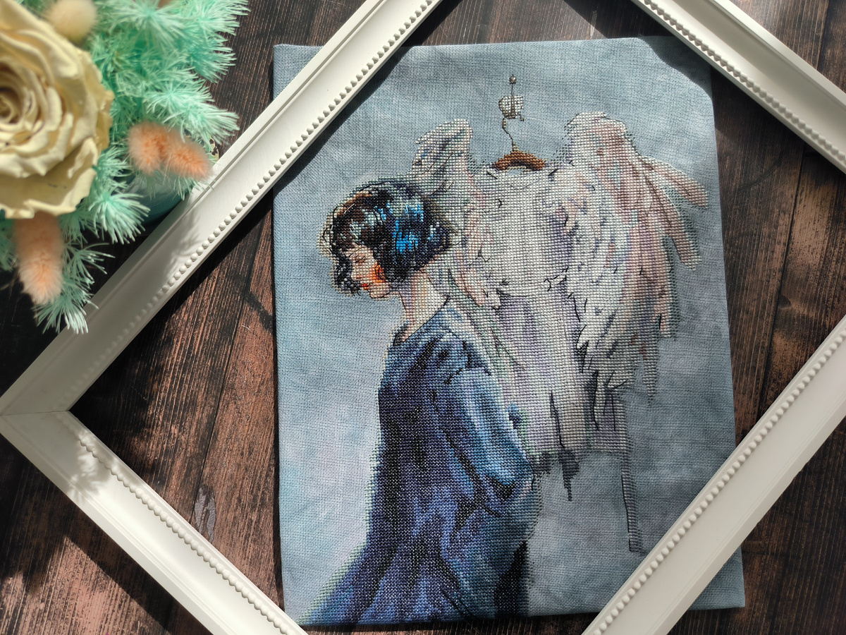 Этот набор запал мне в душу сразу как я увидела его в обзорах с Формулы рукоделия, на которой его презентовали.Набор был приобретен очень быстро, а вот отшив занял больше года...Стартовала я почти сразу как купила, вышила голову ангела и отложила, не понимала почему не могу продолжить его. А потом однажды я поняла, что Ангелу просто нужна другая основа, и к счастью у меня как раз был нужный окрашенный отрез, и вот тут то уже пошло дело - каждый раз когда я брала этот процесс, он двигался легко и непринужденно, а я каждый раз удивлялась, как легко и в удовольствие продвигаю эту работу!