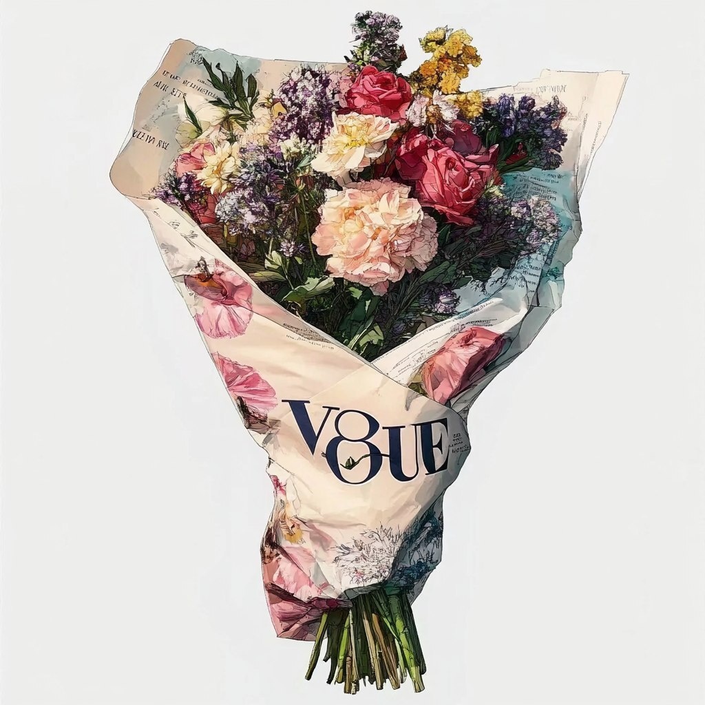 Создано на основе запроса: An illustration of a bouquet of flowers wrapped in a sheet torn from a Vogue magazine