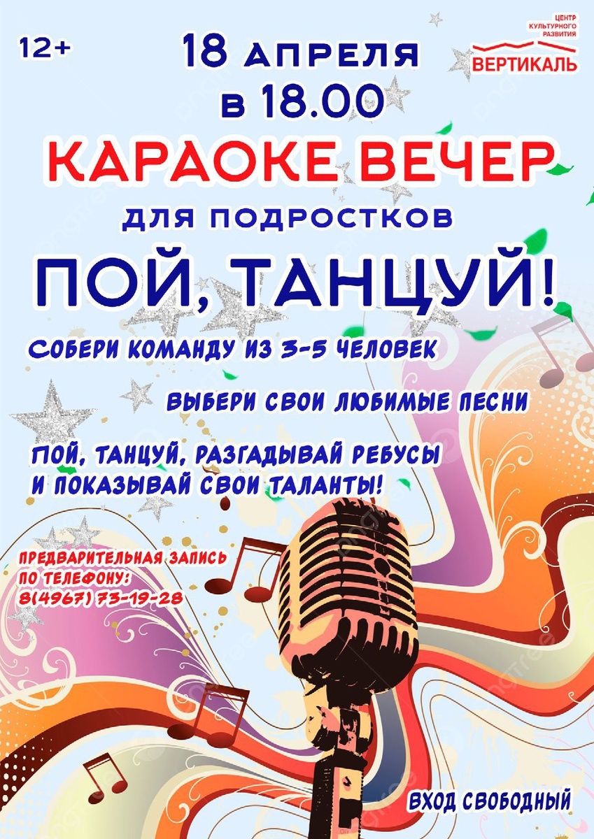 ✨ Караоке вечер «Пой, танцуй!» Собери команду из 3-5 человек; пой, танцуй, разгадывай ребусы и показывай свои актерские таланты 🎤Что для этого нужно? Просто собрать команду из друзей и подруг, предварительно записаться у администратора ЦКР «Вертикаль» и сказать, какие песни вы хотели бы исполнить на вечере, чтобы наш звукооператор подготовил фонограммы. 🚫 Возраст: 12+ 📆 18.04.2025 🕒 18:00 🏢 ЦРК "Вертикаль" г. Пущино 📍 г.о. Серпухов, г. Пущино, проспект Науки, 7 💰 Вход свободный❗️ #webСерпухов ✅ Мероприятия Серпухов https://dzen.ru/id/66f01c6eb4c6fe60c9ca1608 http://vk.com/serpukhov_events http://dzen.ru/serpukhov_events