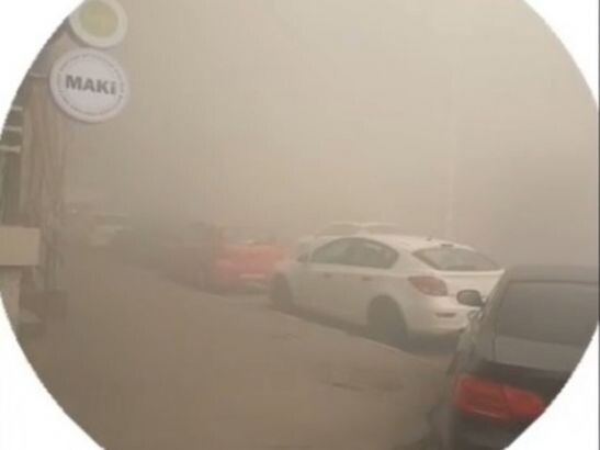 На снимках видно, что клубы дыма буквально заполонили всю улицу. Из-за дымки практически не видно дорогу.