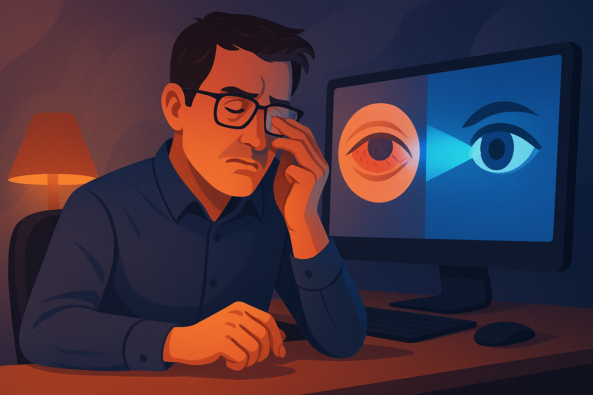 В наш век цифровых технологий сложно представить день без экрана: смартфоны, планшеты, ноутбуки и мониторы стали неотъемлемой частью жизни. Однако повсеместное использование гаджетов оказывает значительное влияние на зрение, особенно при длительной и регулярной нагрузке на глаза. В этой статье я расскажу, как экраны влияют на здоровье глаз и что можно сделать, чтобы сохранить зрение. Это состояние возникает при длительном фокусировании взгляда на экране. Основные симптомы: Причина – снижение частоты моргания и постоянное напряжение мышц, управляющих фокусировкой. Экран снижает частоту морганий почти вдвое, особенно когда человек сконцентрирован. Это приводит к испарению слезной пленки и ощущению сухости, жжения или зуда. У детей и подростков длительное использование гаджетов может ускорить прогрессирование близорукости. Постоянная работа вблизи снижает способность глаз к быстрой фокусировке на дальние расстояния. Излучение экранов содержит высокоэнергетический синий свет, который мож