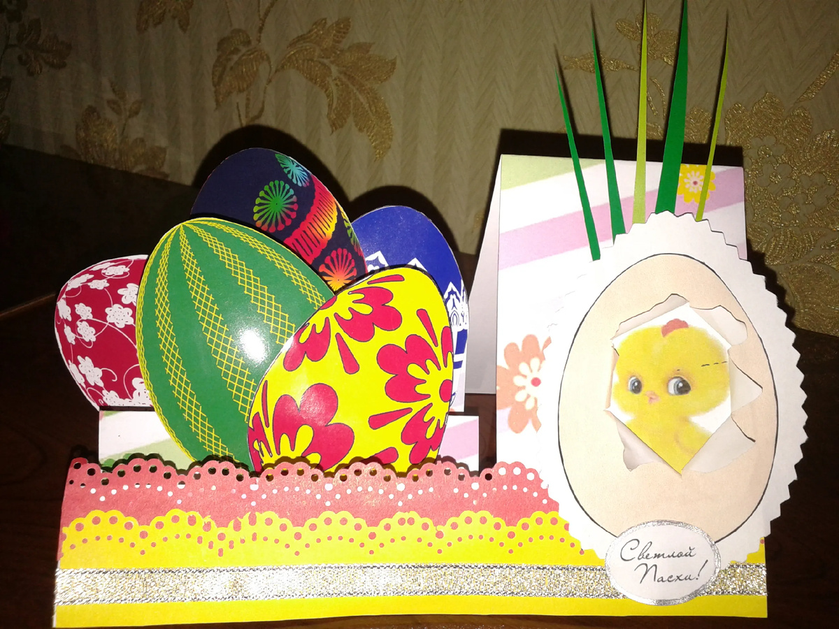Эта открытка стала моим первым лайфхаком, чтобы сделать пасхальные открытки. Мама хранит её на полке! Интересный факт: яйцо — символ новой жизни, традиционный для Пасхи, и дети с радостью узнают этот образ.
